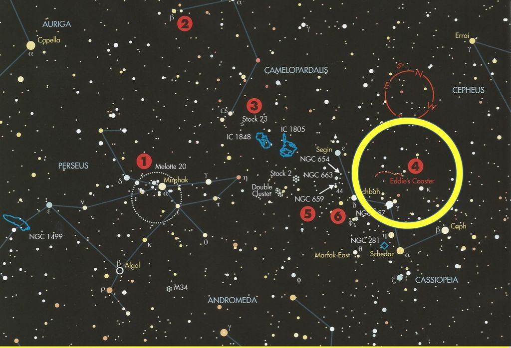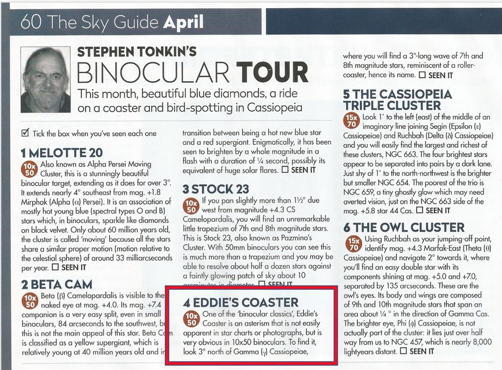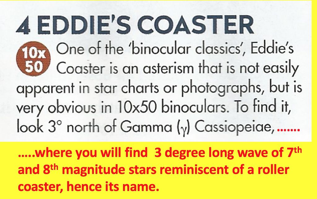 Eddie, who regales us with information on the sights to see in the sky, and events of historical interest, has also become well known for identifying an asterism in the constellation of Cassiopeia. This has become known as Eddie's Coaster for its shape which resembles a roller coaster. It gained some popularity when it was identified in the Astronomy Press.
