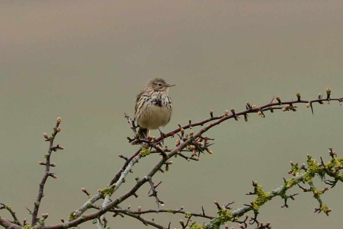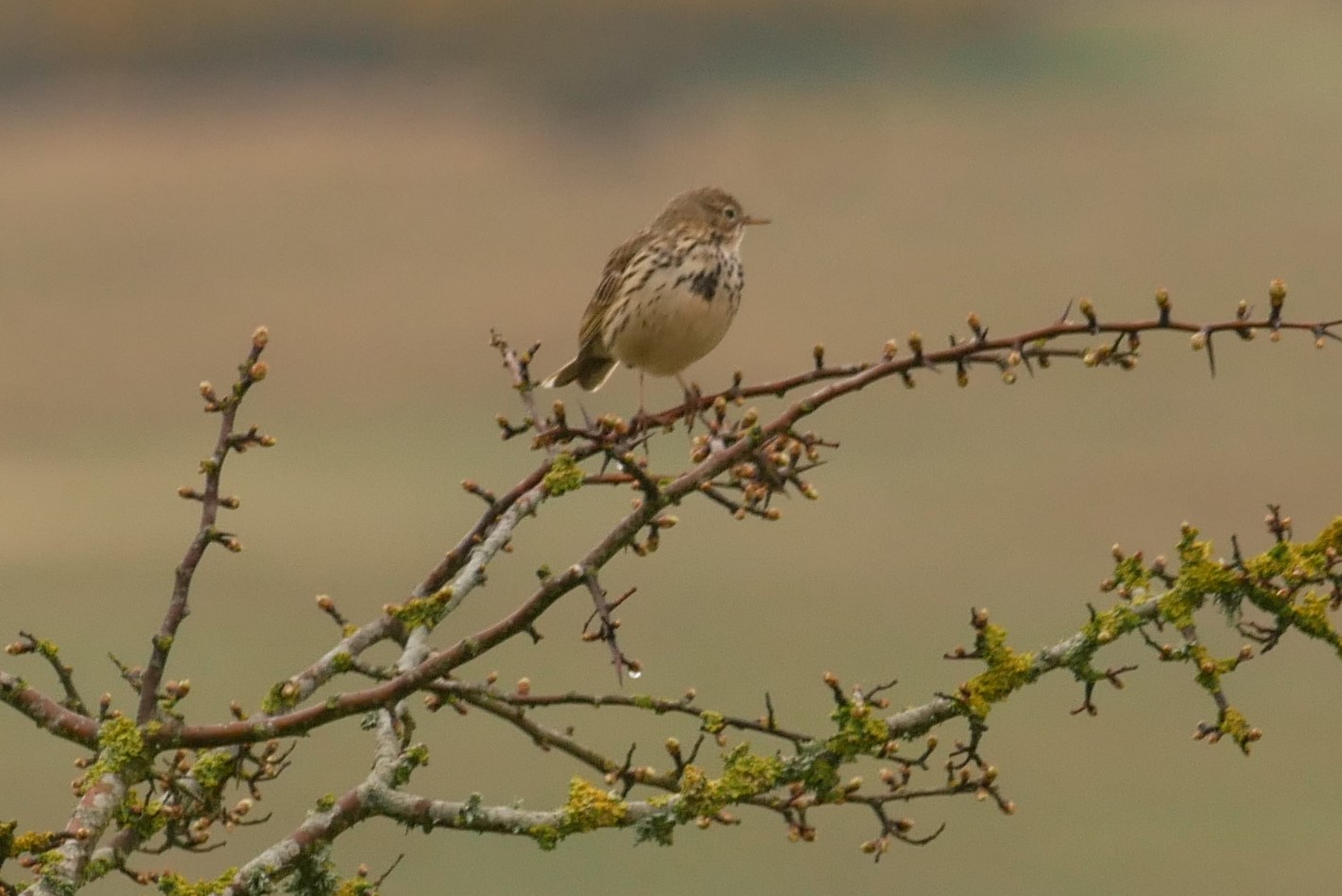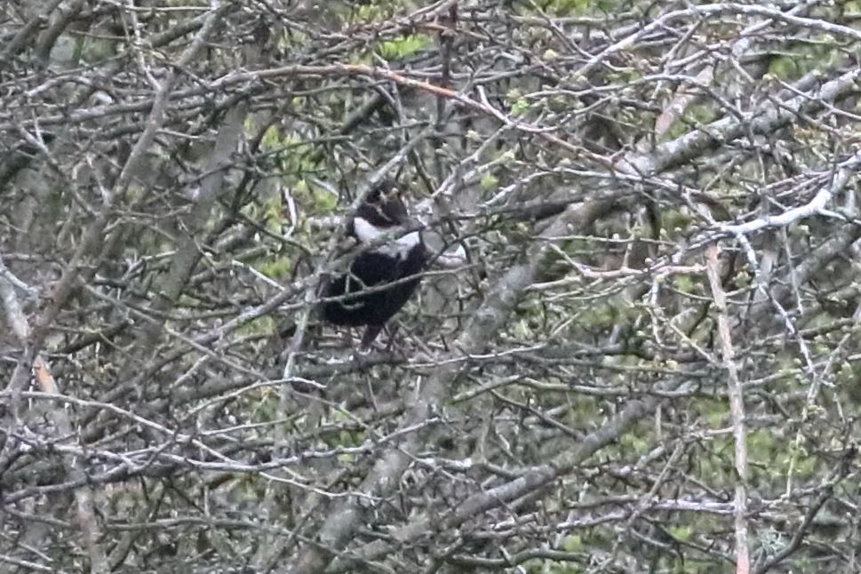 Eleven members of our group arrived at the Cleeve Hill Common car park in mist and light drizzle, and we set off in a north-easterly direction. Fortunately, the mist and rain gradually cleared and the whole area became alive with the songs of Skylarks, Meadow Pipits and Tree Pipits which accompanied us throughout our walk. A quiet spot overlooking a dry valley gave us extensive views of scrubby trees and bushes alongside plenty of grassland, and we were rewarded with good sightings of Tree Pipits, Yellowhammers, Red Kites, Blackbirds and Magpies (which we hoped at first might be the elusive Ring Ouzels), a Stonechat, and the songs of Willow Warblers and Chiffchaffs. Finally after persistent searching with a telescope we located two Ring Ouzels, probably a male and a female on the opposite side of the valley. They were a long way off, but we walked across and watched them again for a while at about 100 yards distance, which gave us a much better view.