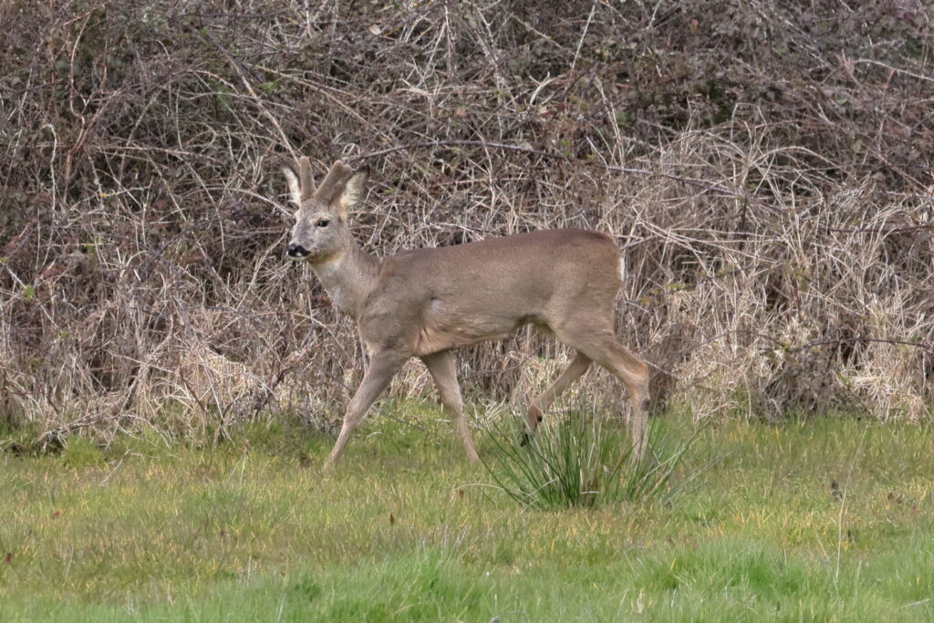 Four species of duck were seen – Mallard, Gadwall, Teal and Shoveler (with Pochard and Tufted Duck added at the second hide and Shelduck on the saltmarsh). A Grey Heron and several Canada Geese were on the bank and there was an Oystercatcher asleep on the island. Little Grebes were ‘zittering’ and gave good views, showing off their summer plumage. Two Buzzards thermalling caught our attention (with a third in a nearby tree), then a pair of Stonechat was found dashing around some bramble bushes. Behind the pool, several Roe Deer were seen (four in total).